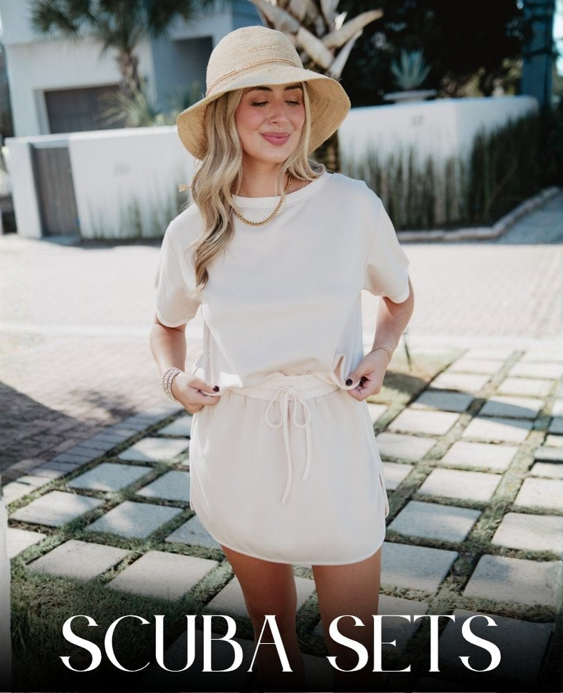 This matching scuba set drives conversion thanks to its versatility — perfect for airport outfits, girls’ trips, coastal vacations, and casual everyday wear alike. Merchandise next to travel accessories, beach bags, tumblers, and spring break essentials for easy complete-the-look add-ons.
